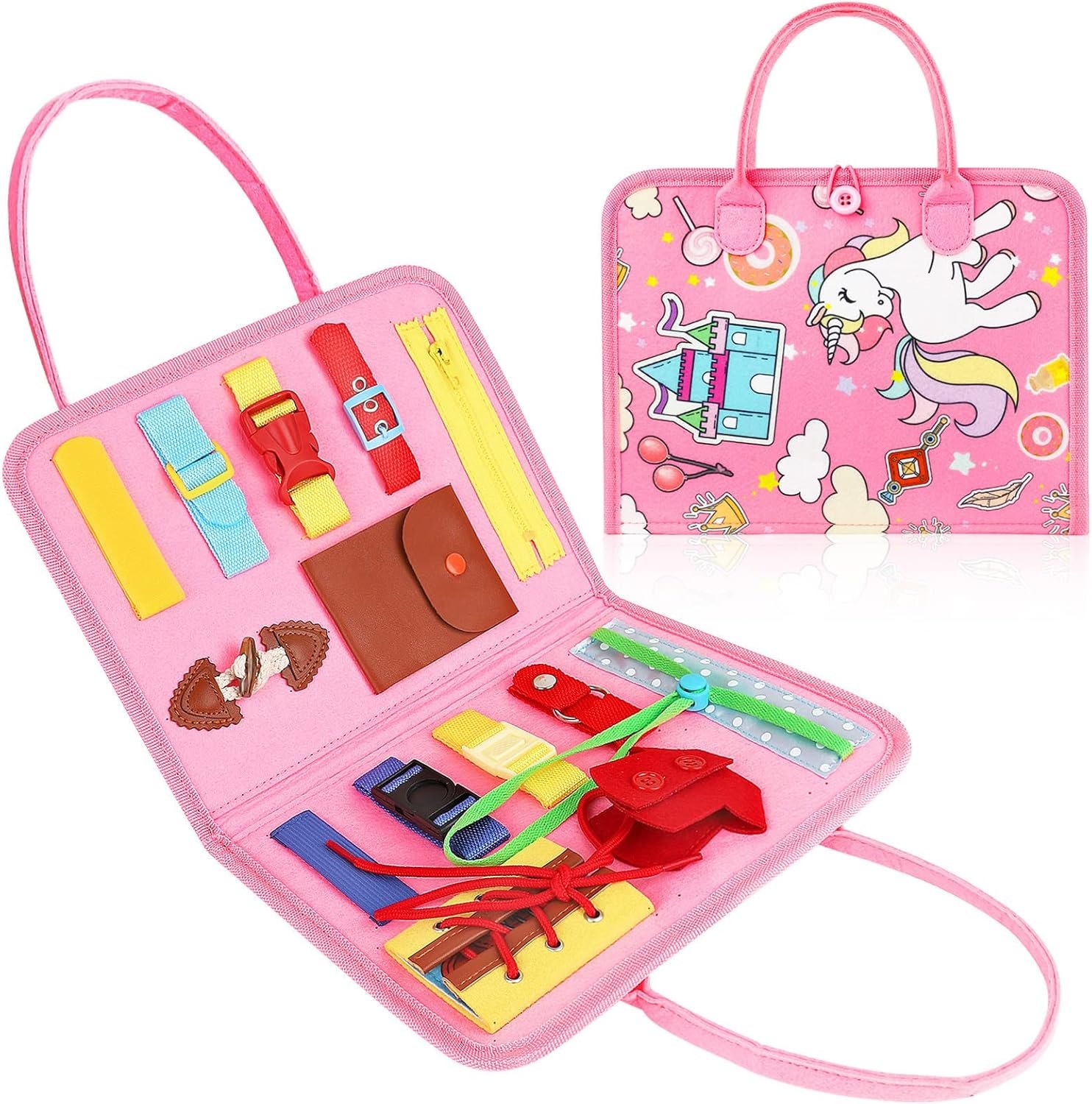✨ Hands-On Learning – Includes buttons, buckles, zippers, snaps, Velcro, lacing, time-telling clock, shape sorting, and puzzle activities.